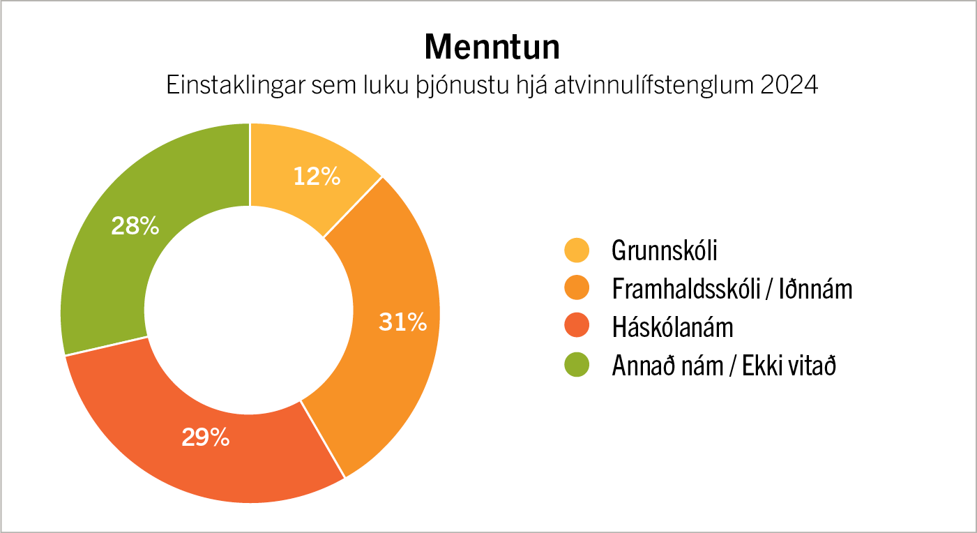 Á myndunum hér fyrir neðan má sjá áhugaverðar upplýsingar sem tengjast þjónustuþegum VIRK sem luku þjónustu hjá atvinnulífstenglum árið 2024.