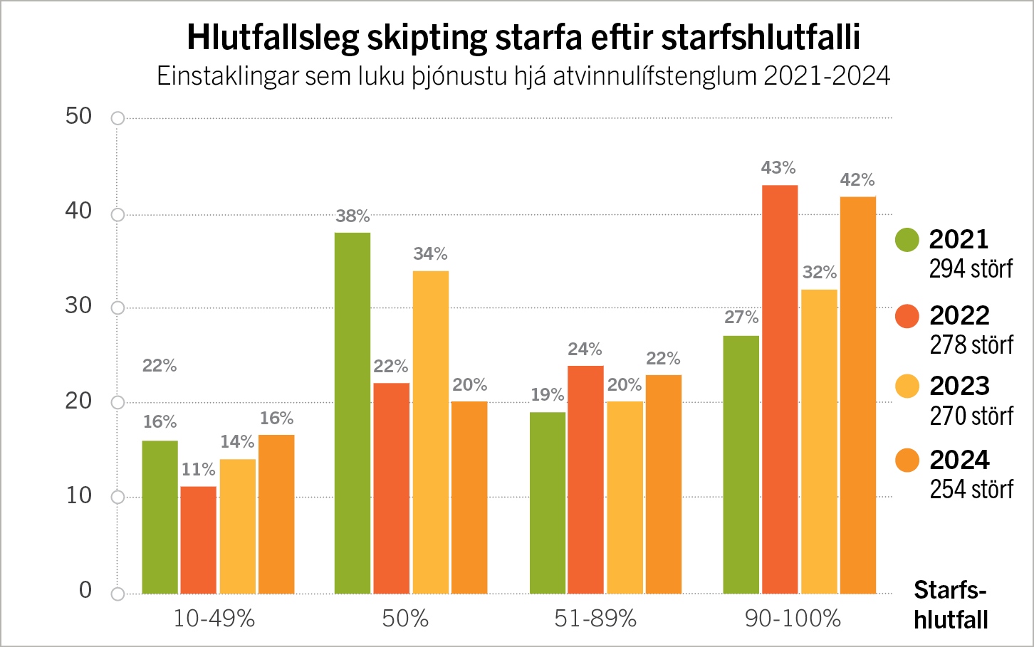 Þjónustuþegum VIRK sem geta nýtt sér aukna aðstoð við að komast inn á vinnumarkaðinn stendur til boða að fá sérstaka aðstoð frá atvinnulífstenglum VIRK. Margir þessara einstaklinga eru með skerta starfsgetu og stefna á hlutastörf við lok starfsendurhæfingar. Hinsvegar fara einnig margir þeirra í fullt starf við lok þjónustu - 42% árið 2024 - eins og sjá má á myndinni „Hlutfallsleg skipting starfa eftir starfshlutfalli“ hér fyrir neðan.
