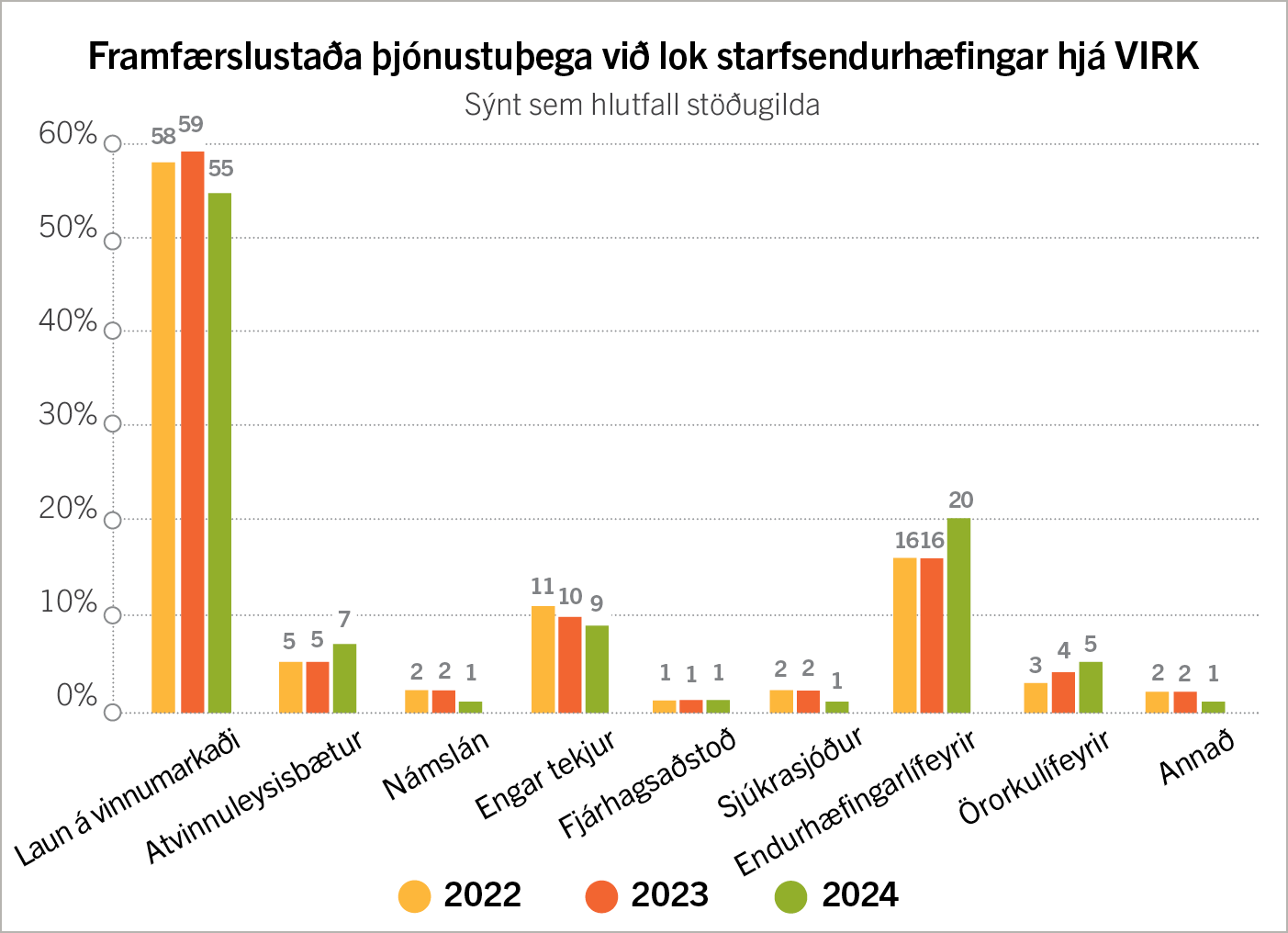 Myndin sýnir hlutfall stöðugilda útskrifaðra einstaklinga með mismunandi framfærslustöðu í lok þjónustu á árunum 2022-2024.