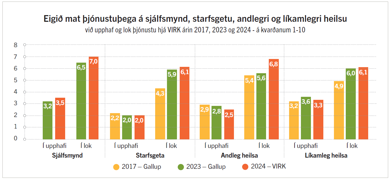 Myndin hér að ofan sýnir niðurstöðu við upphaf og lok þjónustu og hliðrun línunnar sýnir að einstaklingar meta heilsu sína og lífsgæði mun betri við lok þjónustu en við upphaf hennar.