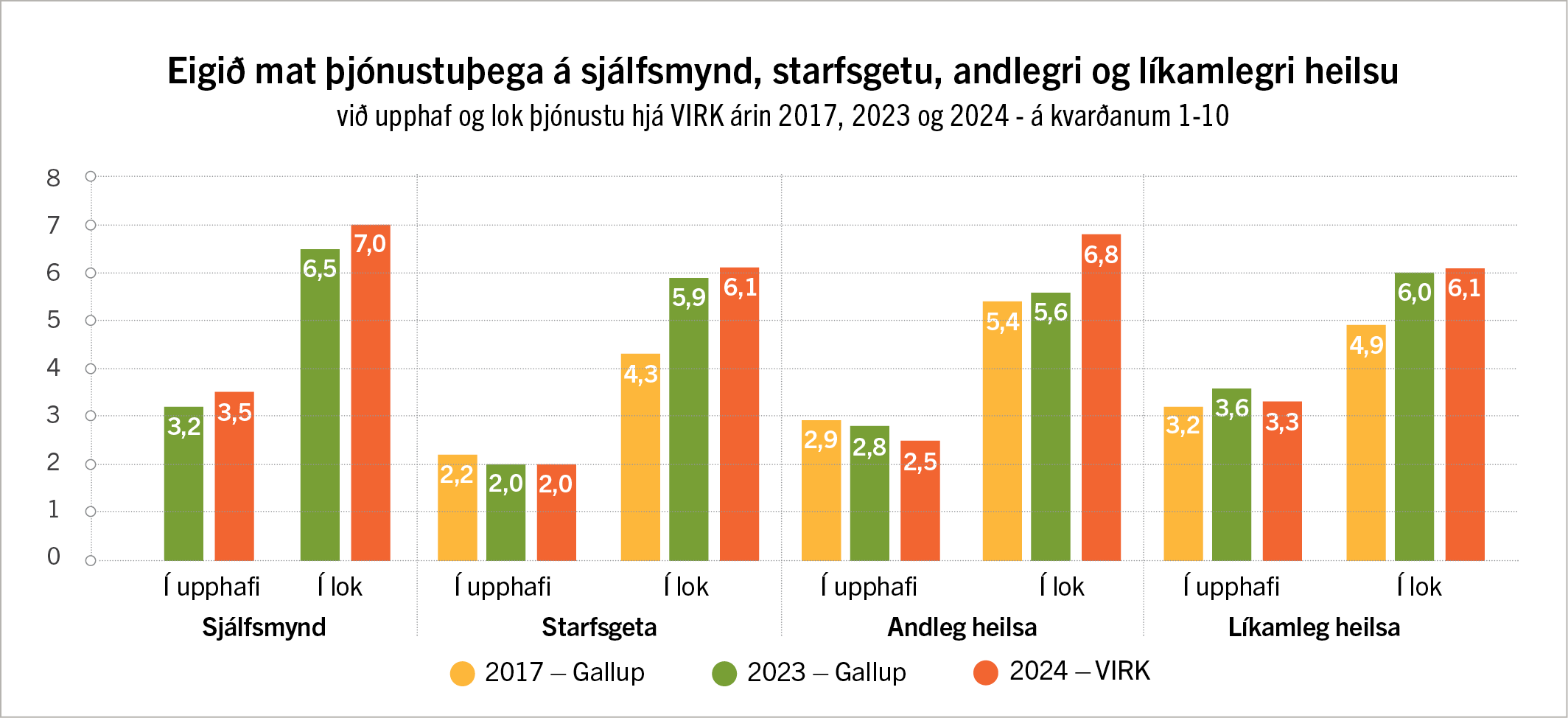 Þjónustukannanir VIRK sýna að þjónustuþegar eru undantekningalítið mjög ánægðir með þjónustuna og telja hana auka verulega bæði lífsgæði sín og vinnugetu eins og sjá má á myndinni hér að ofan.