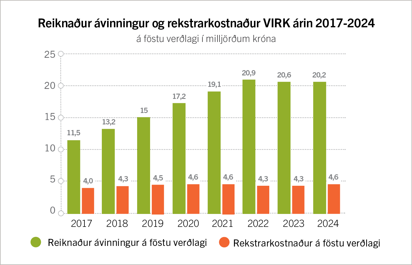 20,2 milljarða heildarávinningur var af starfsemi VIRK árið 2024 og ávinningur á hvern útskrifaðan einstakling er 14,3 milljón krónur samkvæmt ráðgjafafyrirtækinu Talnakönnun sem metið hefur ávinninginn af starfsemi VIRK árlega frá 2013. Heildarávinningurinn nemur tæplega fimmföldum rekstrarkostnaði starfsendurhæfingarsjóðsins.