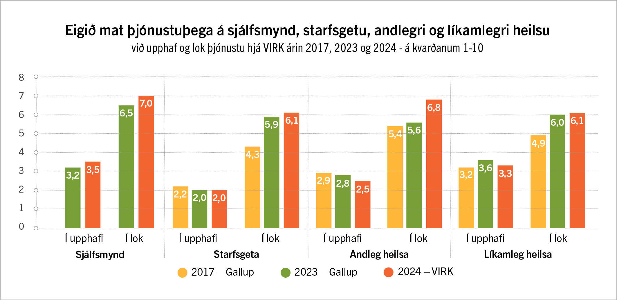 Samkvæmt þjónustukönnunum VIRK telja einstaklingarnir að starfsendurhæfingarþjónusta VIRK hafi haft mikil og jákvæð áhrif á stöðu þeirra hvað varðar bætta sjálfsmynd og aukna vinnugetu og meta heilsu sína og lífsgæði mun betri við lok þjónustu en við upphaf hennar.