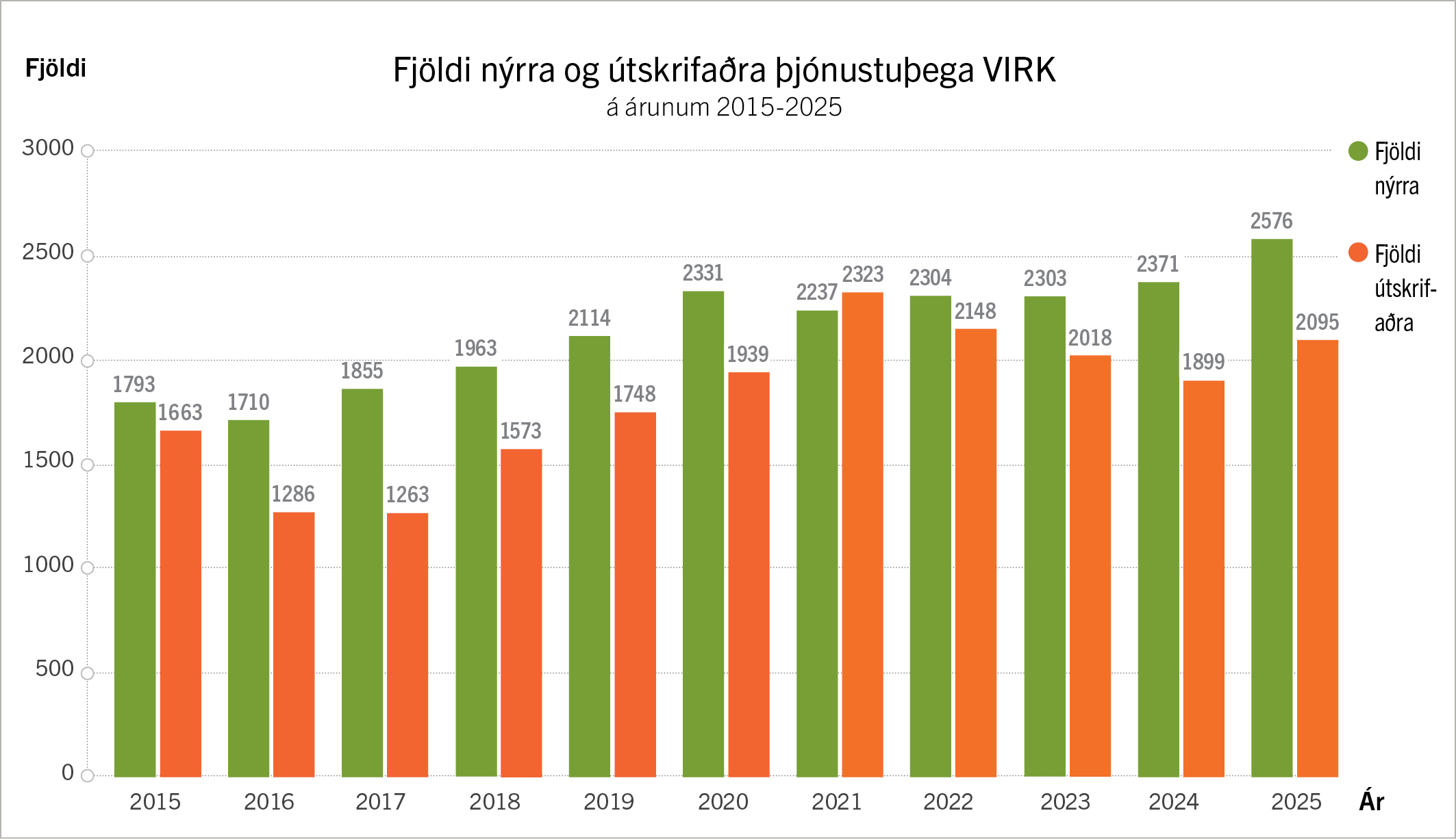Ekkert lát er á eftirspurn eftir þjónustu VIRK og til VIRK leitar nú stærri hópur en áður með fjölþættan og flókinn vanda. Í byrjun árs 2026 höfðu tæplega 27.000 einstaklingar einstaklingar komið til VIRK og sumir oftar en einu sinni. Þannig voru skráðir tæplega 31.000 starfsendurhæfingarferlar í upplýsingakerfi VIRK frá upphafi í árslok 2025.